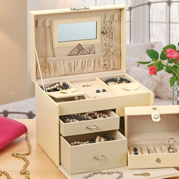 Keep favourite jewellery locked away in this stylish case, featuring five top compartments, two pull-out drawers and a lined interior