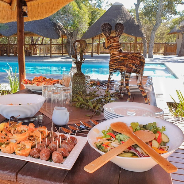 Guests staying in the Tented Camp can enjoy a daily braai (traditional bbq) meal in the boma, Each day is comprised of two safaris, one in the early morning, and one in the late afternoon, going into the night. In the evening, guests can take a plunge in the infinity pool that borders on the river or enjoy a drink from the pool-side bar. Each safari lasts 3-3.5 hours.