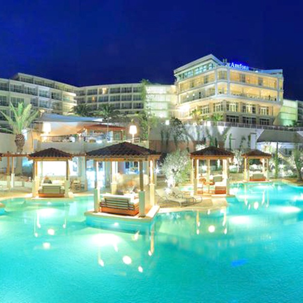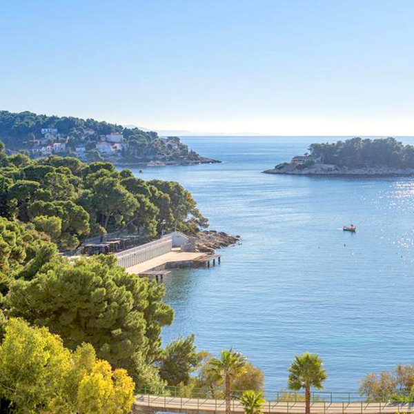 Nestled in a private bay on the Island of Hvar, a four-star Amfora Hvar Grand Beach Resort welcomes guests with modern accommodation and on-site amenities, including a cascading swimming pool, gym, and a kids club.