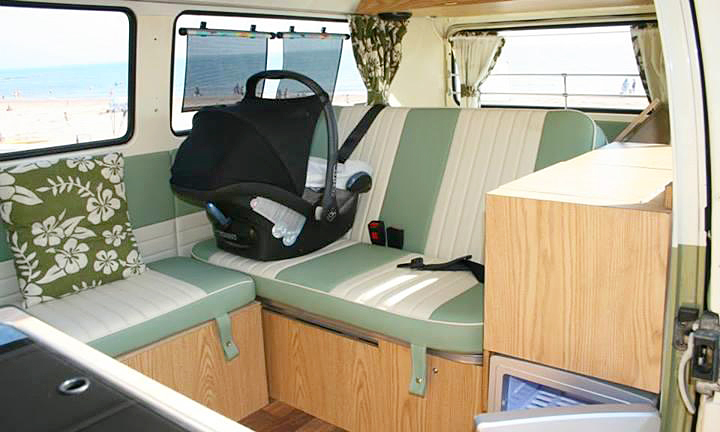 Keeping their original exterior, the camper vans boast modern interiors fitted with kitchen utensils, china crockery, ring gas hobs and camping gas.