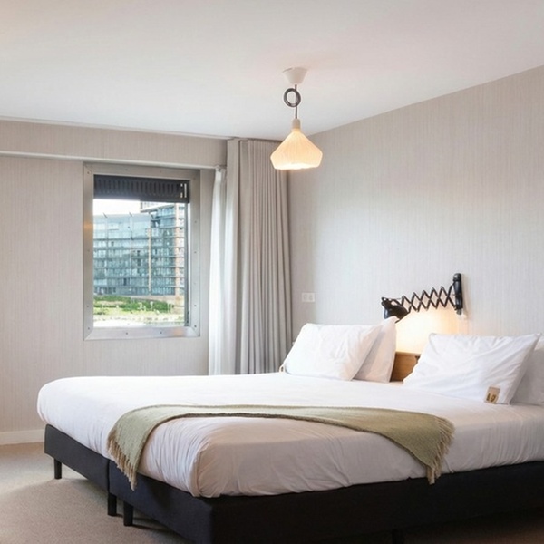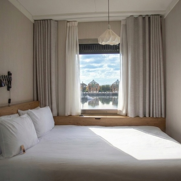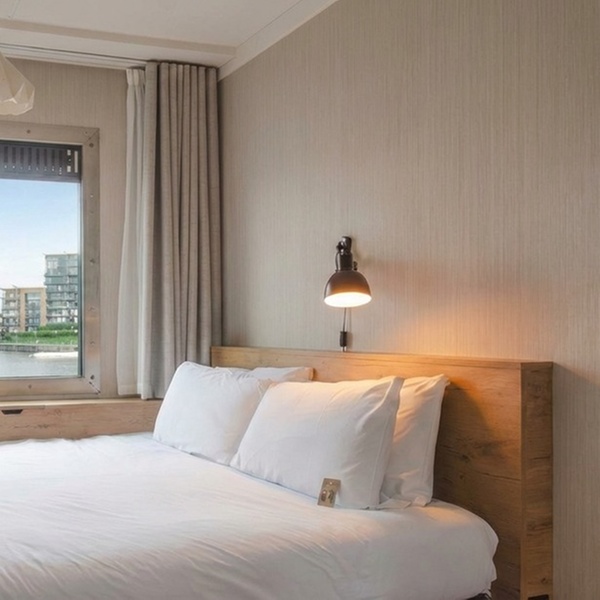 The bedrooms are thoughtfully designed with a minimalist Dutch aesthetic, emphasizing space, comfort, and sustainability through the use of natural and re-purposed materials. Guests can choose from various room types, including those with stunning views over the water or the surrounding city docks. Each room is equipped with modern facilities, featuring ensuite bathrooms with walk-in rain showers and locally-made toiletries to ensure a high-quality stay.