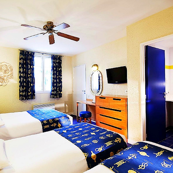 • The spacious en suite rooms with contemporary design are adorned in colourful sea-themed furnishings with large double beds as well as practical bunk ones covered in blue linen.