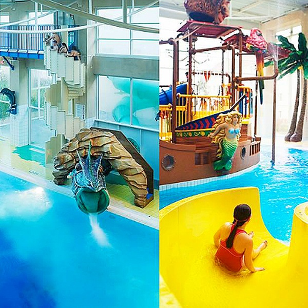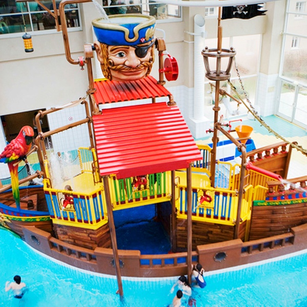 • Children and adults alike may enjoy a cool dip in the indoor pirate-themed swimming pool, featuring a central fortress-ship equipped with water slides and high trampolines.