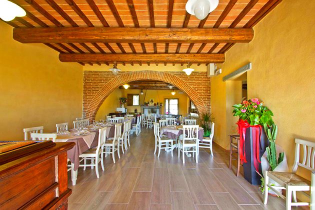 • A rural setting, with high brick arches and wooden beams, the restaurant provides guests a seasonal menu of traditional Tuscan cuisine with tasty dishes that put an emphasis on freshly farmed local products.