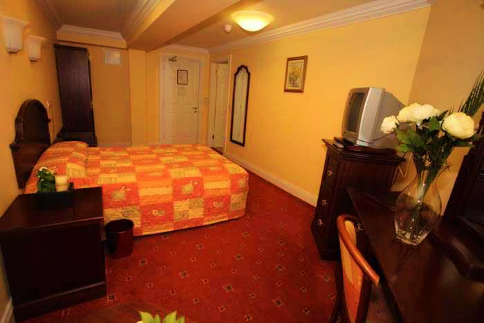 The en suite rooms are decked out in warm shades of gold and rust, with matching carpets and upholstered chairs, and come fitted with TVs and hot drink-making facilities.