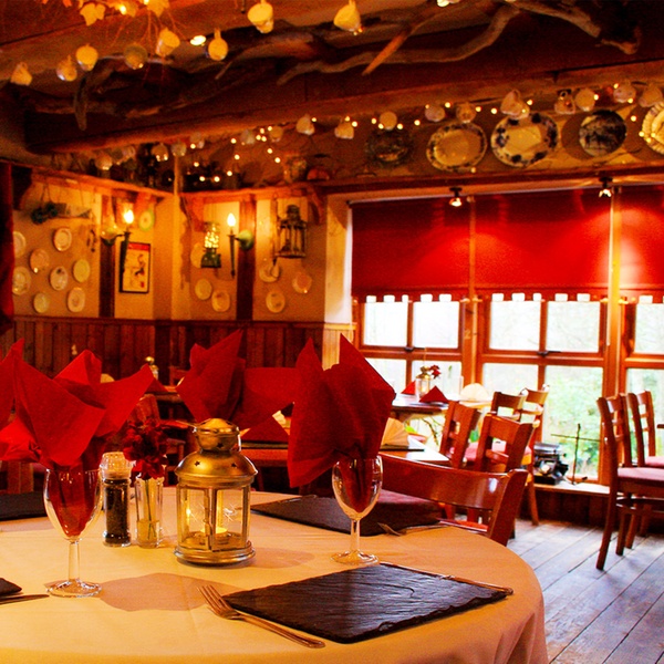 Visitors may sample a multitude of Scottish plates in a traditional setting with exposed beams, an open fireplace and stone-decorated walls.