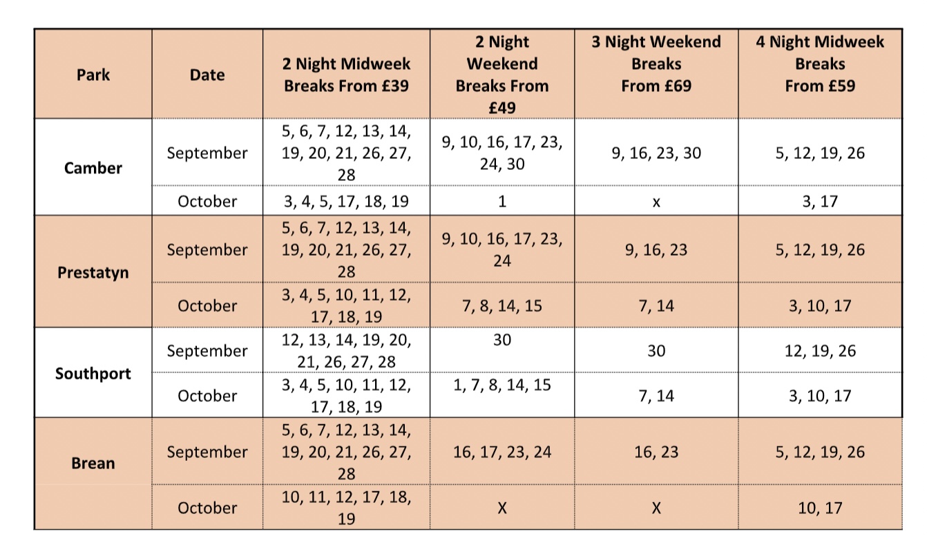 Valid to 31 Oct 2022. 2-night midweek breaks start on Monday, Tuesday, or Wednesday. 4-night breaks are Monday to Friday. 2-night weekend breaks start on Friday or Saturday. 3-night breaks are Friday to Monday.