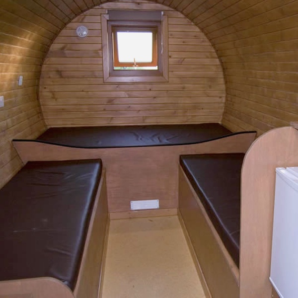 - Glamping pods fitted with a double and 2 single bed spaces, a mini fridge, microwave, kettle, TV and a heater