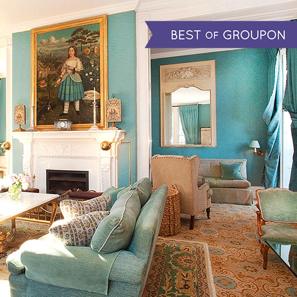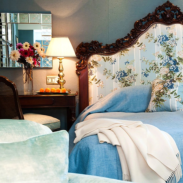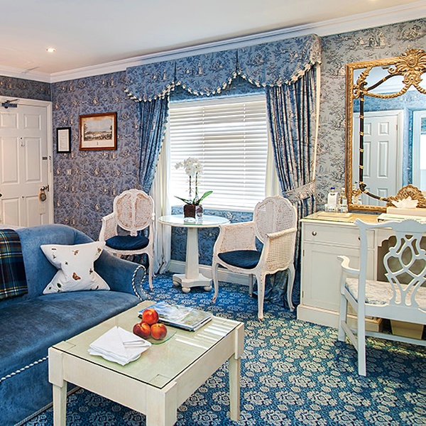Visitors are invited to spacious interiors featuring elegant furnishings, rich fabrics and matching wallpapers.