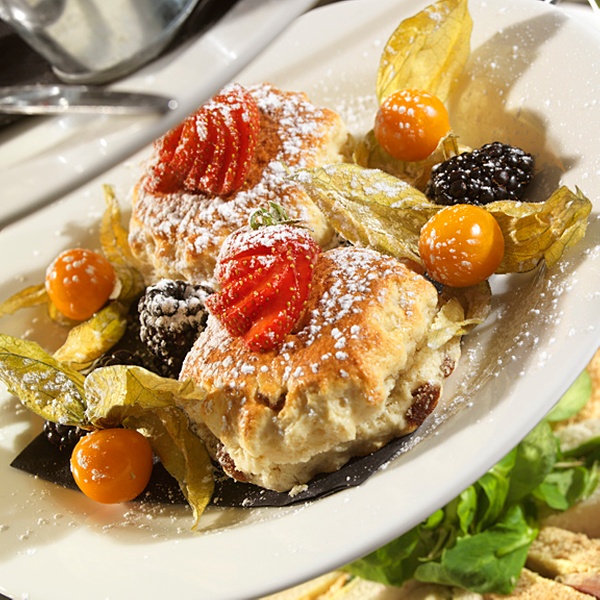 The cream tea includes tea or coffee, sandwiches and scones with jam and cream.