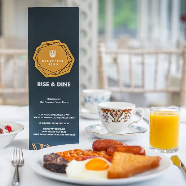 Booking required by phone: 020 8461 8600or by email: enquiries@bromleycourthotel.co.uk, and subject to availability.