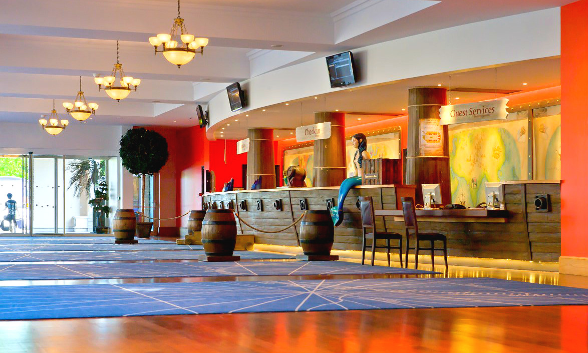 Children and adults alike may enjoy a cool dip in the indoor pirate-themed swimming pool at the Explorers Hotel, featuring a central fortress-ship equipped with water slides and high trampolines.