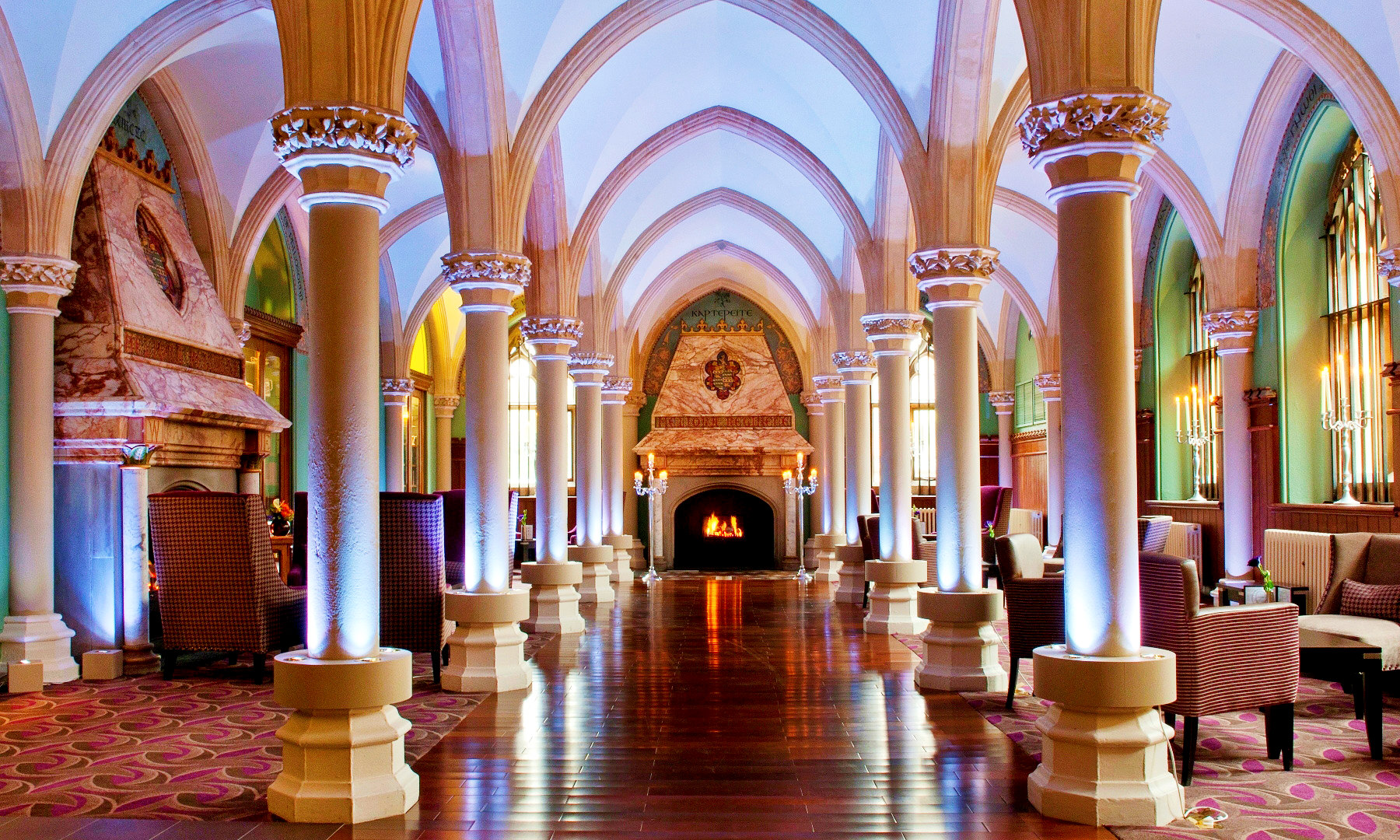 Appetites for exercising are catered for at the indoor swimming pool boasting blue mosaic and a cluster of loungers, while outdoors, the 13 acres of manicured gardens act as a verdant spot for leisure walks in the afternoon.