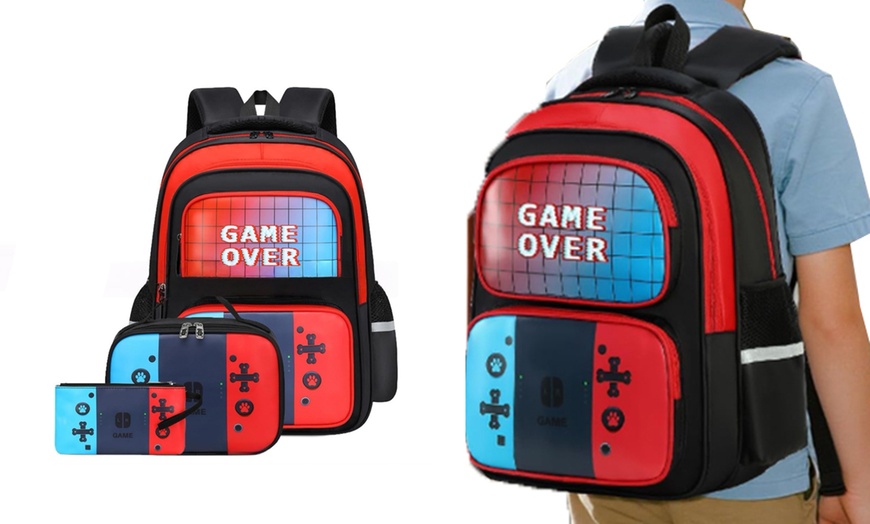 - Gamer backpack set including a boys’ backpack, lunch box, and pencil case with bold, cool gaming designs
