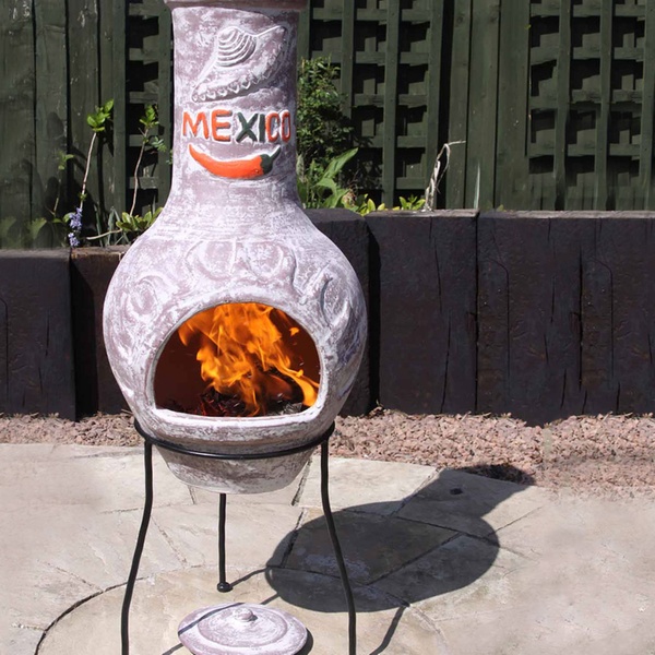 - Large clay chimenea displaying Mexican style decorations of chilies and sombrero (Mexican hat) in dark red with flames coming out of the mouth
