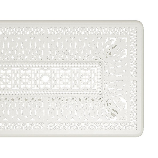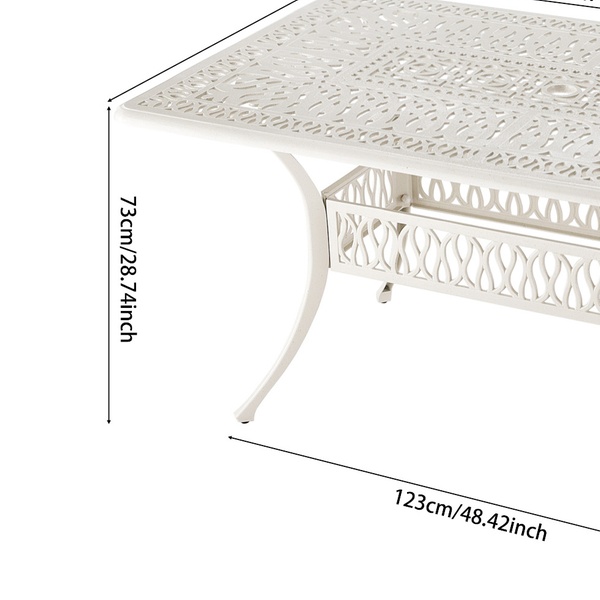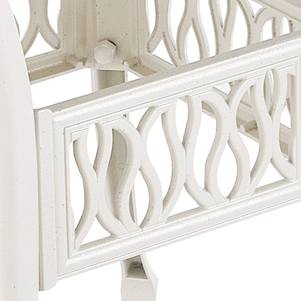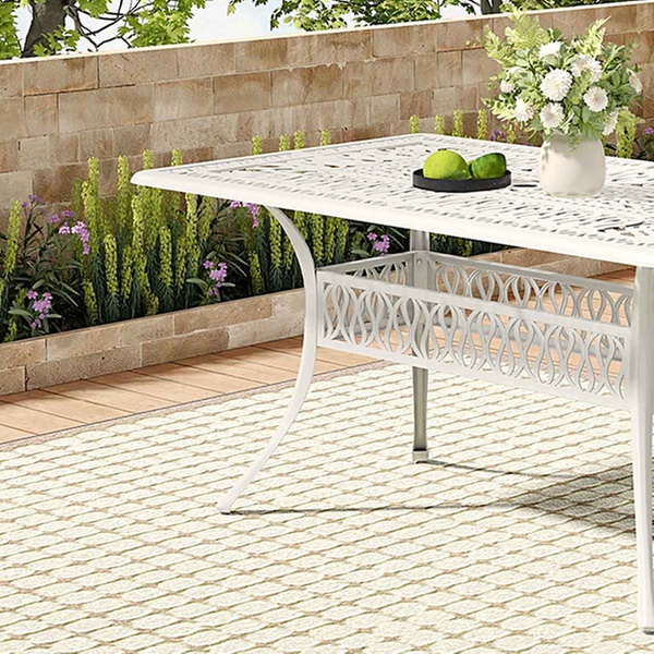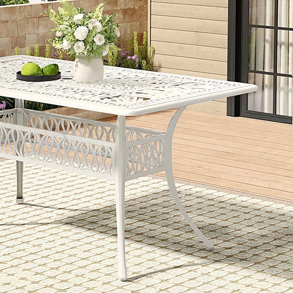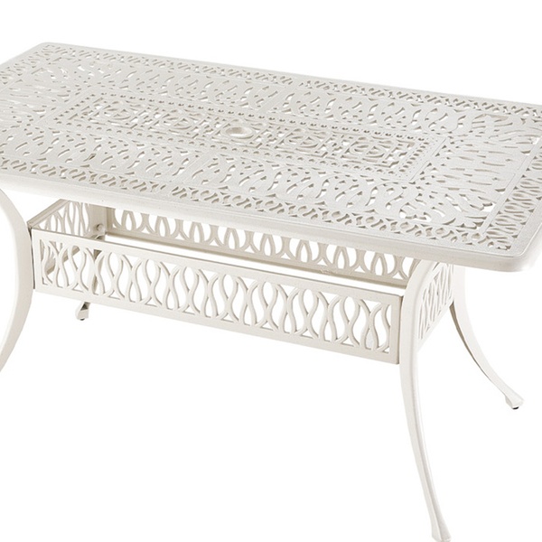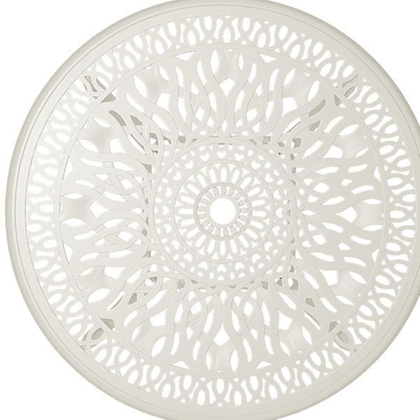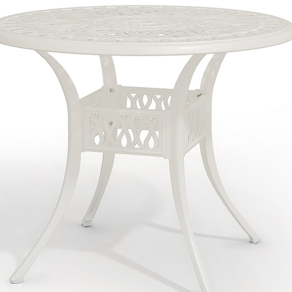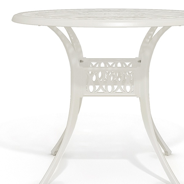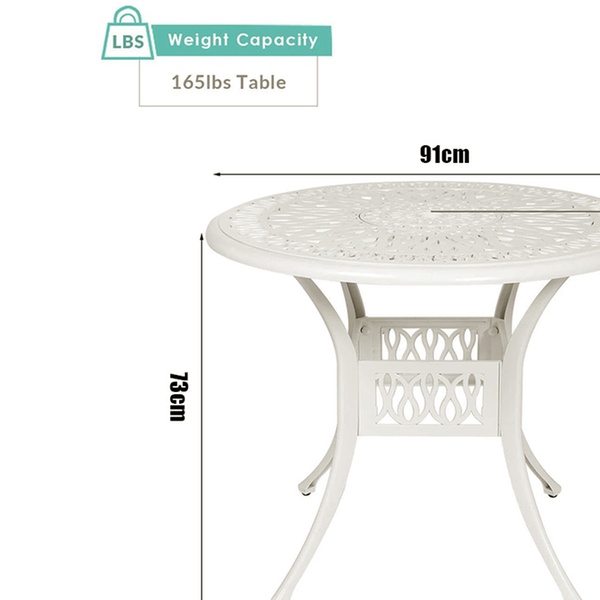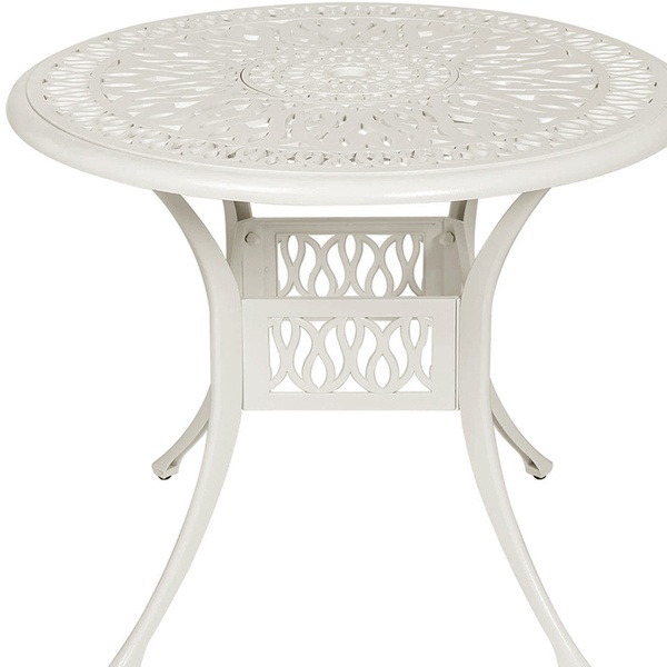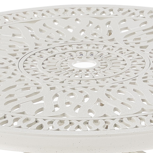 Classic white with a parasol hole, this round vintage bistro table adds charm and comfort to any outdoor gathering