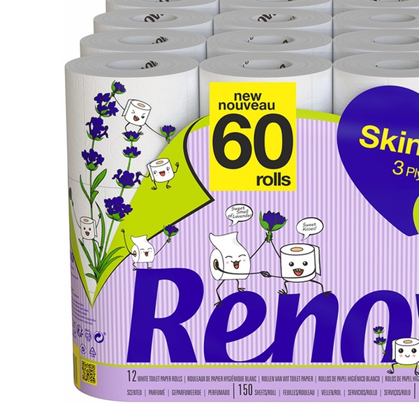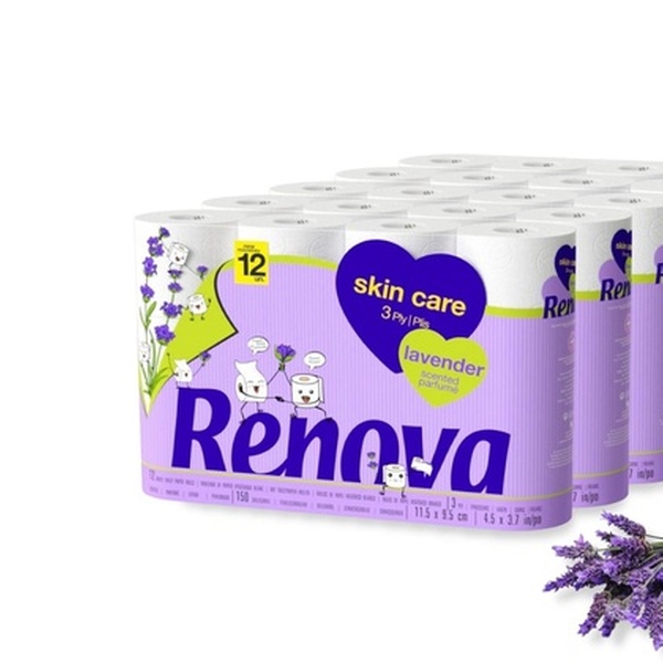 60 rolls of Renova Skin Care three-ply toilet paper with a delicate lavender scent, ideal for an entire family