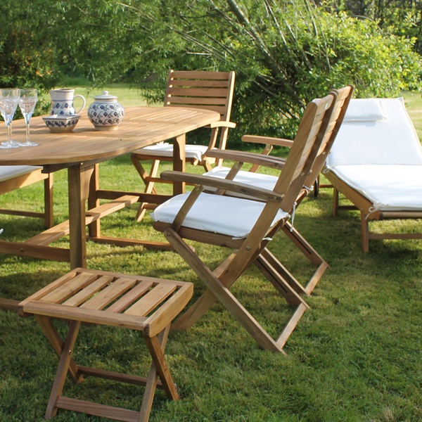 Comprising a bench, folding chairs, dining table, side table and sunlounger, this set is ideal for a warm afternoon on the patio