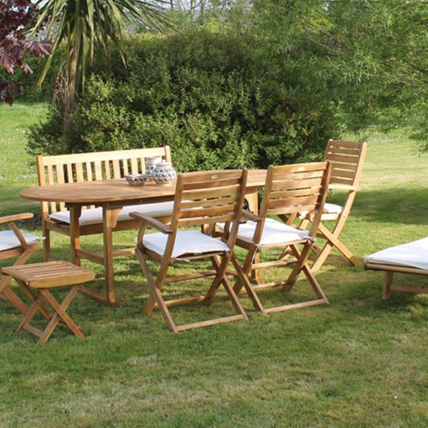 - Set includes a bench, four folding chairs, dining table, folding side table and sunlounger