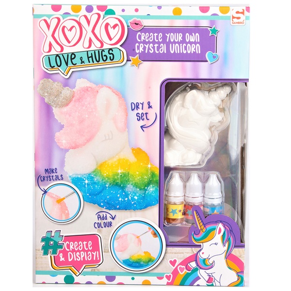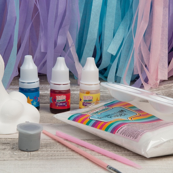 - Set includes: one moulded unicorn, one glitter packet, one metallic paint pot, three colouring dye droppers, one paint palette, one bag of aluminium, one paintbrush, one mixing stick, instruction sheet