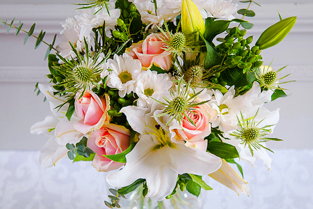 - Pure Berry: lillies, white thistles, green berries and soft pink roses