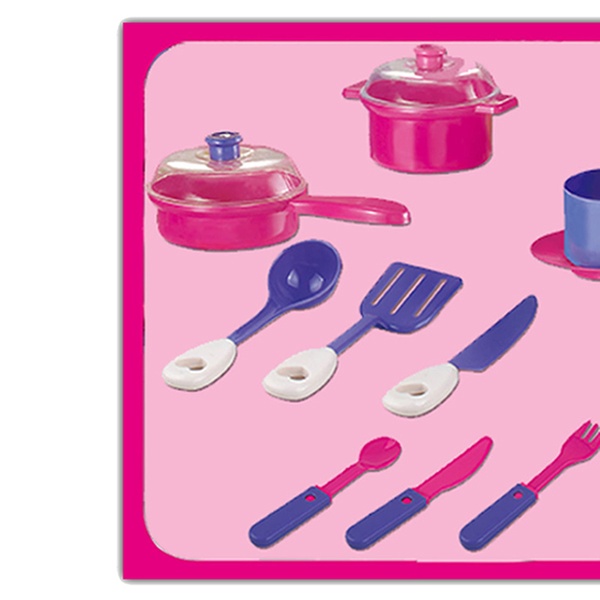 - Twelve kitchen utensils including cutlery, pots, salt shaker and sauce bottle