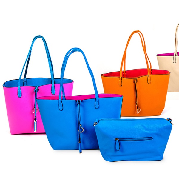 These Kris-Ana high quality faux leather tote bags make a chic and stylish accessory and come with a handy inside bag which can be used as a clutch. They're available in 11 reversible colours to complement any outfit and are equipped with pockets and pouches to organise items.