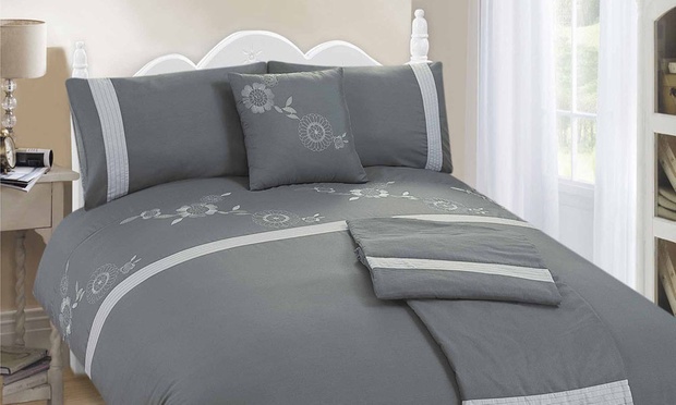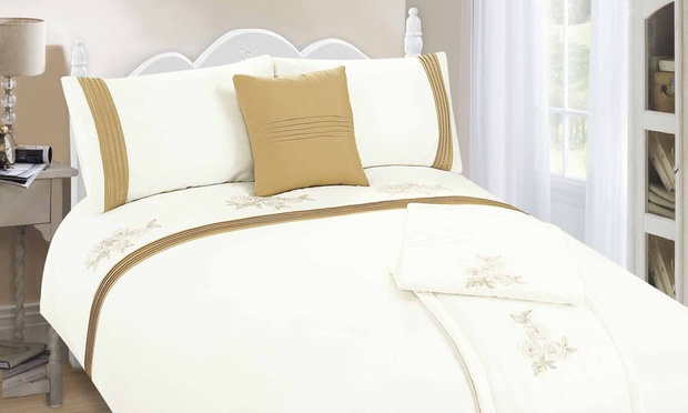 This delicately embroidered set gives beds a chic, understated look and comes with pillowcases, a duvet cover, cushion cover and bed runner