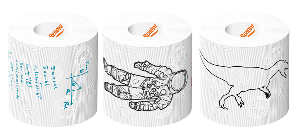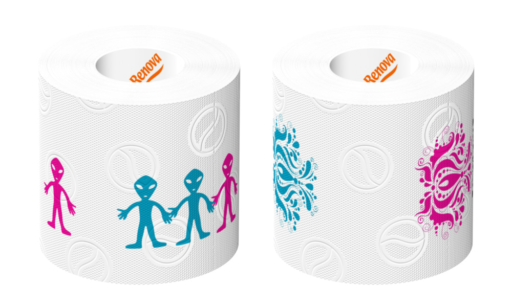 These Renova toilet rolls add originality to bathrooms and toilets with their unique designs and 2-ply touch. Each roll has 140 sheets and there are 24, 48 or 96 roll packs available.