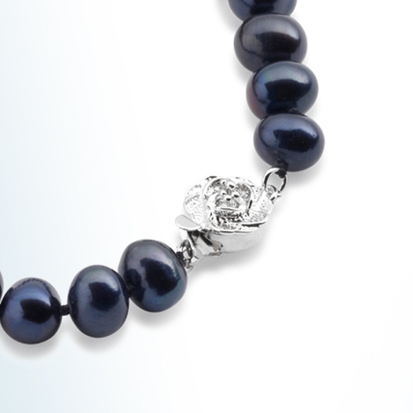A modern take on a classic look, these freshwater pearl jewellery sets consist of a matching necklace, bracelet and stud earrings. Semi-baroque pearls are subtly non-spherical, making for an edgy, original look. The statement sets come in black, and the necklace and bracelet fasten with an ornate, rose-shaped silver-tone clasp for an extra touch.