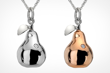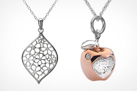 - Choice of designs: pear pendant, apple pendant in silver or rose gold, silver lantern pendant, or multi-leaf necklace and earrings
