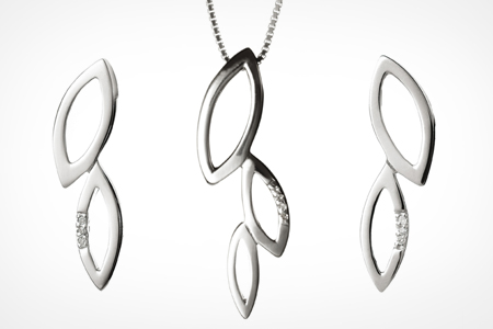 - Multi-leaf silver pendant and earrings set (above) - 35mm pendant and 40-46cm chain; sterling silver; four diamonds on pendant; 24mm matching earrings with three diamonds on each