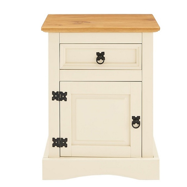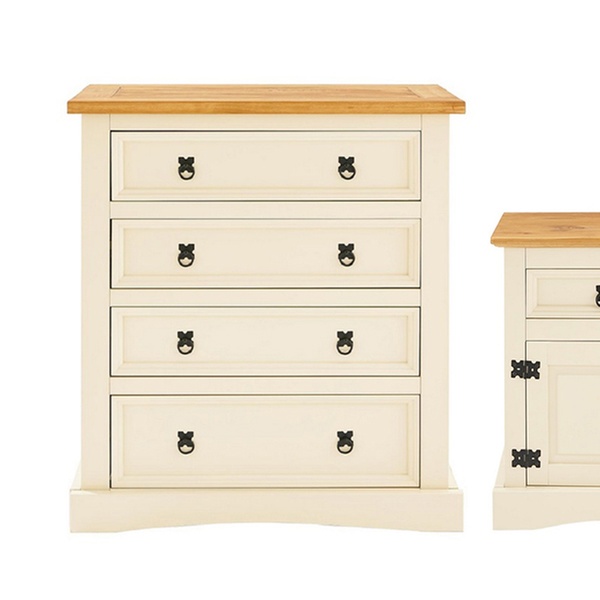 Designed in a Mexican style, this collection combines solid pine wood and MDF with antique style metal hinges and handles