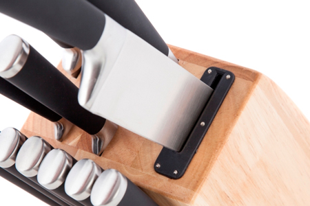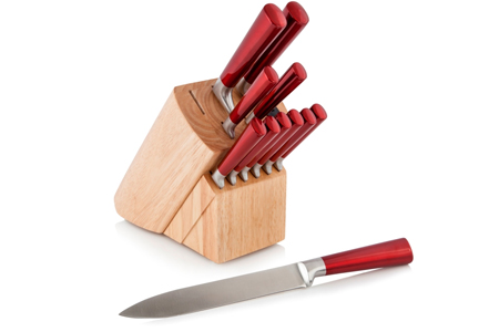These sharpened stainless steel blades are colour-coated with fine-edged blades for precision. Each set includes six steak knives, a bread knife, carving knife, chefs knife, utility knife and paring knife, all of which have ergonomically designed handles, and fit into a sturdy wooden block for easy storage.