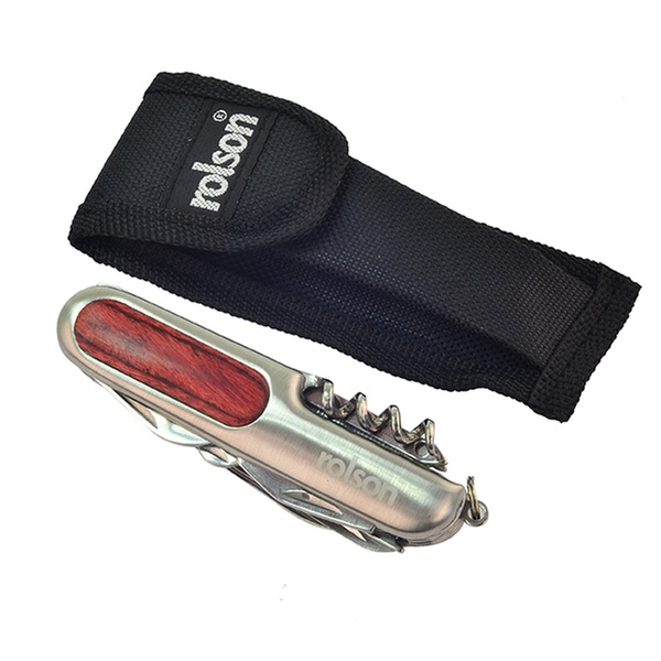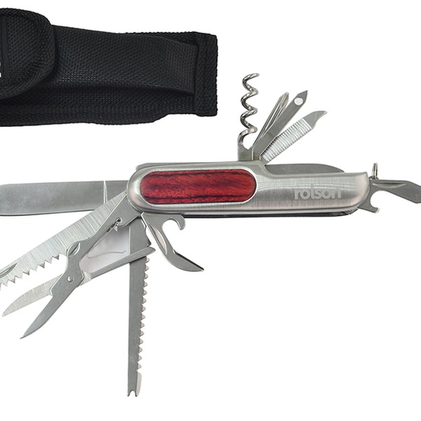 - Features include can opener, saw, scaler, hook, slotted screwdriver, bradawl, crosspoint screwdriver