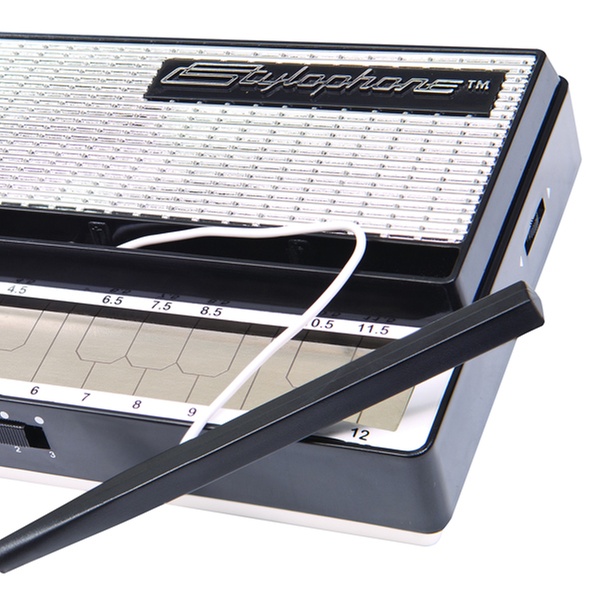 - User creates music by tapping and dragging a stylus across a metallic surface, altering the pitch of the note from the internal speaker