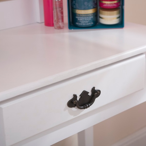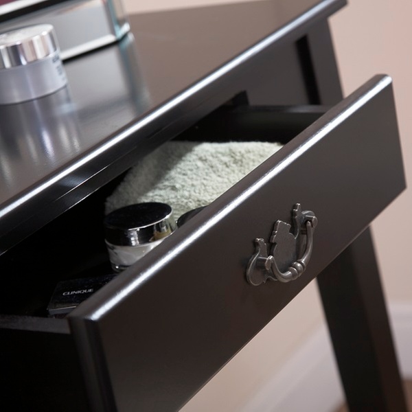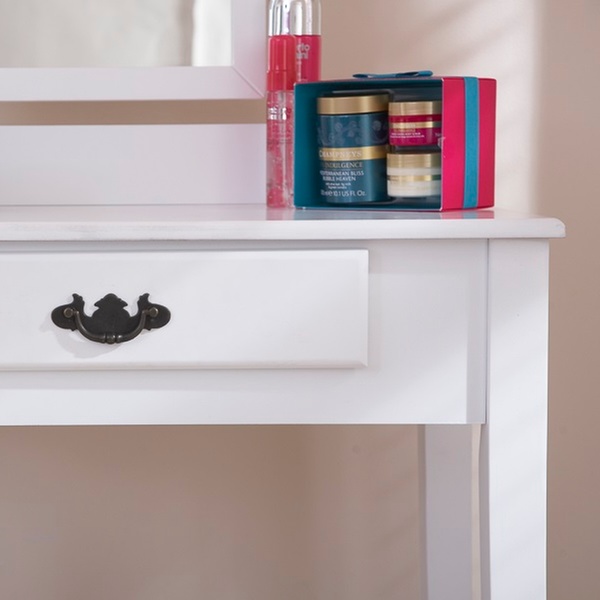 This contemporary and simple dressing table set gives a stylish touch to bedrooms, with its padded seat and its ornamental drawer handle