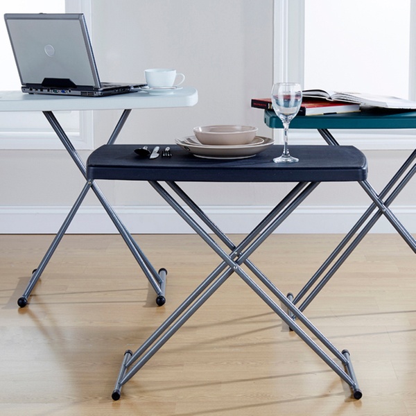 Ideal for outdoor and indoor use, these lightweight folding tables and chairs feature corrosion- and stain-resistant tops