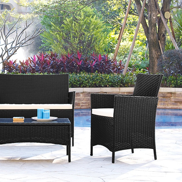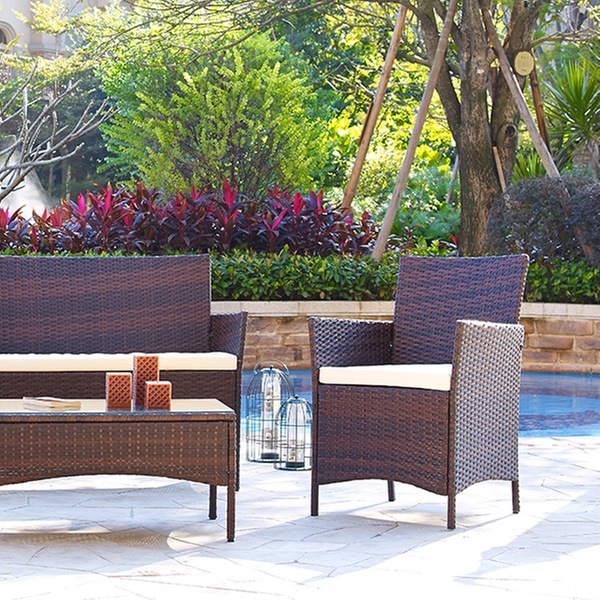 Adding style and comfort to outdoor spaces, these rattan-effect furniture sets feature a woven-wicker design