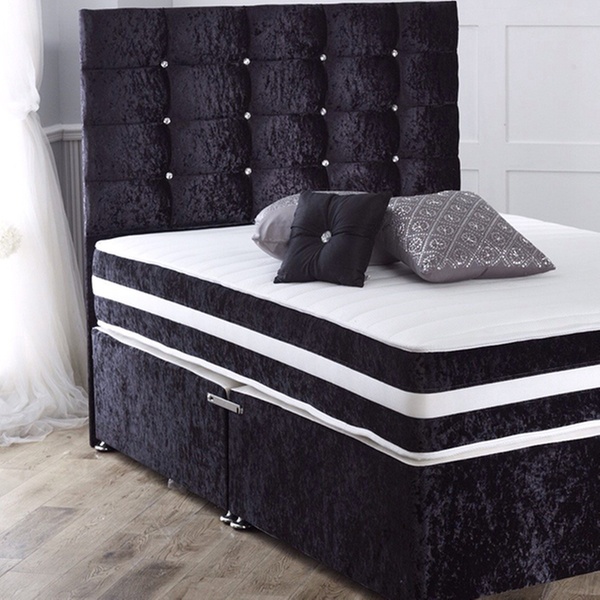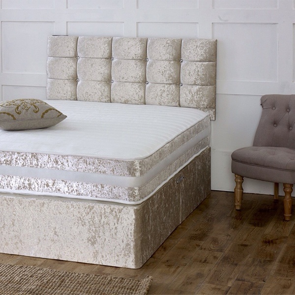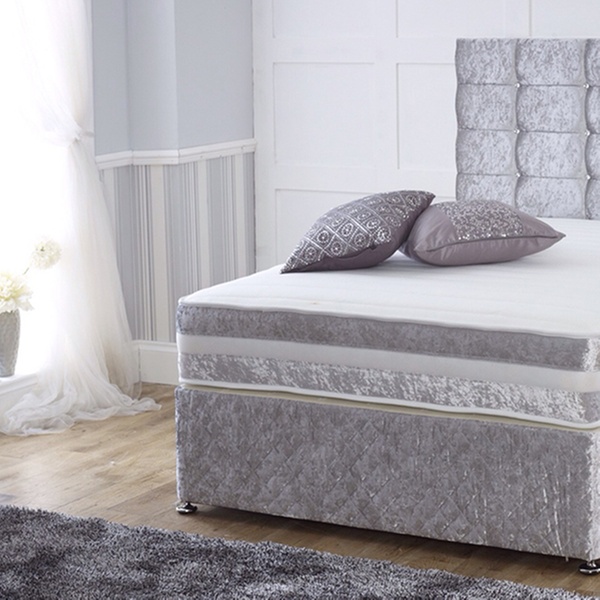 Crushed velvet divan frame with silver feet and link bars, available in 3 different colour finishes, plus a a high end memory foam topper