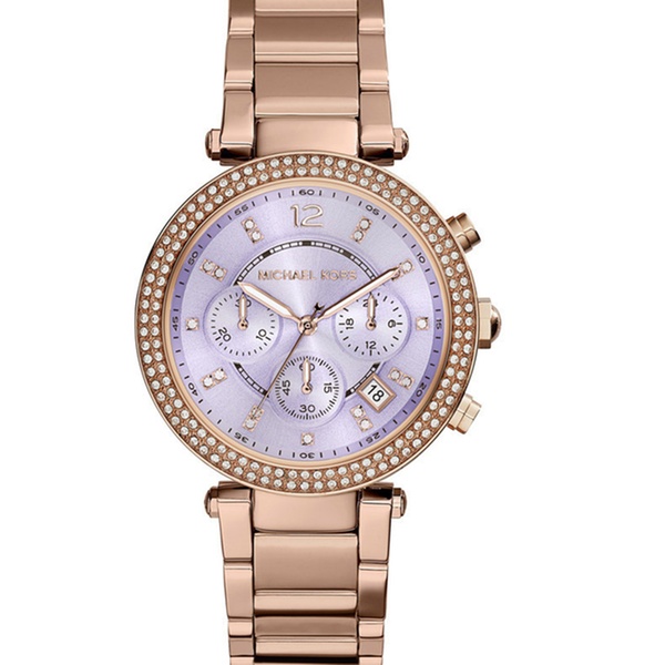 - Lavender chronograph dial with crystal markers, rose gold-tone hands, numerals, luminous accents, three subdials, date window and logo