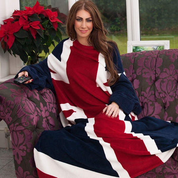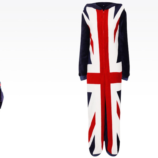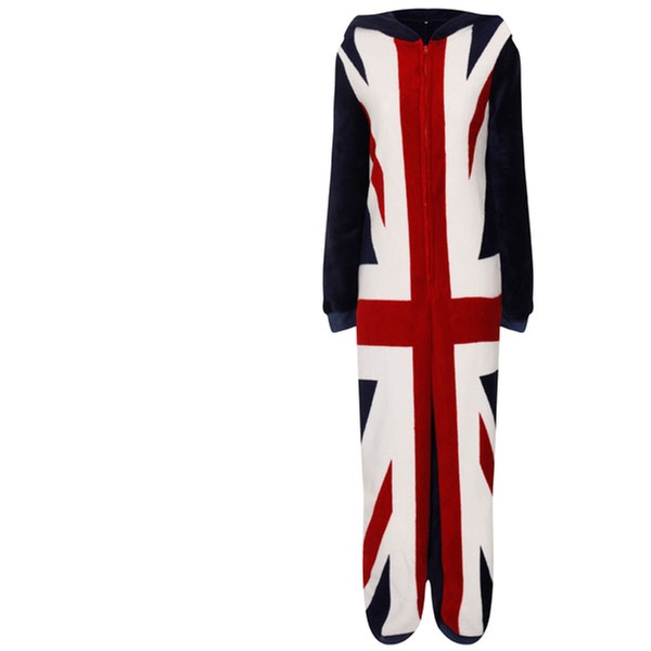 Keep warm and snug with this unisex onesie or TV blanket that fashions the Union Jack flag and features comfortable polyester fleece