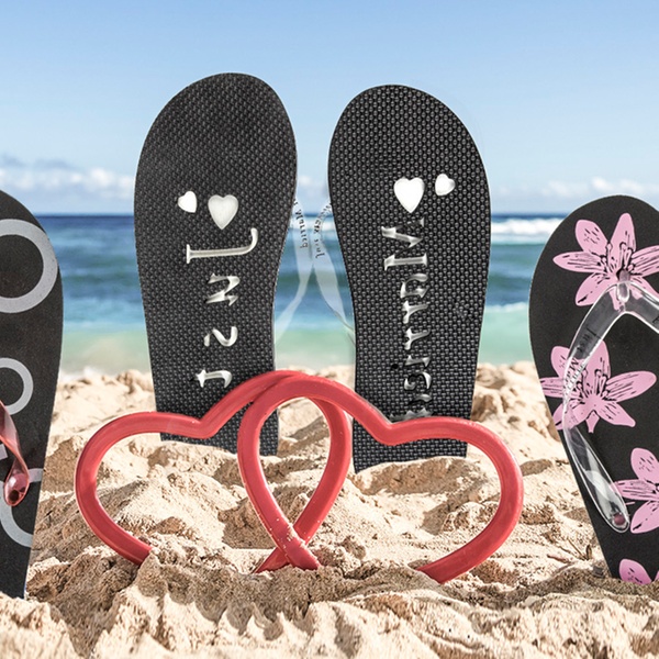 Ideal as a gift, these flip flops come in a variety of designs and have messages written on soles to leave imprints on the sand