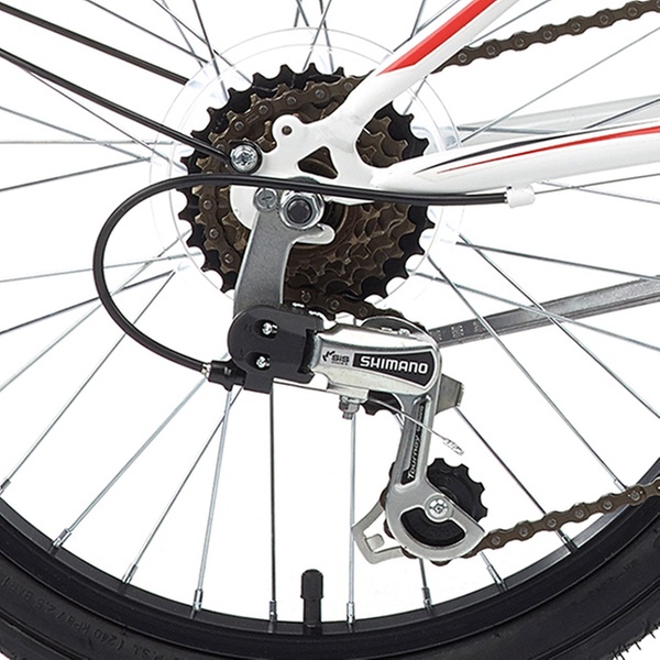 - Gears: 6 speed with twist shifter, Shimano rear derailleur, and a 14-28 tooth freewheel