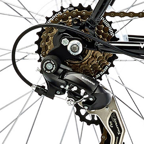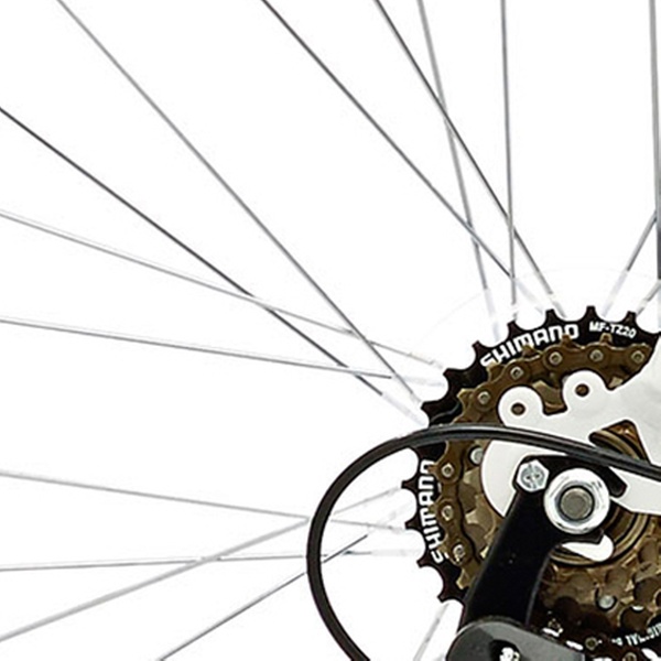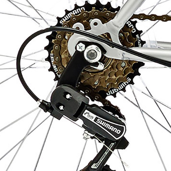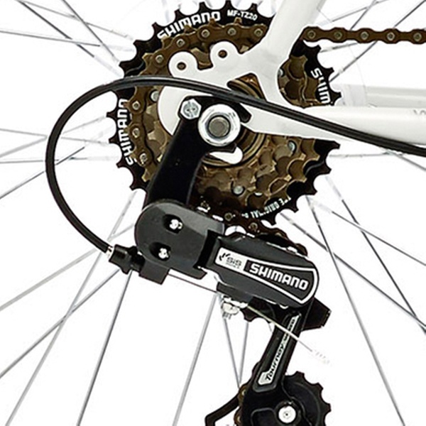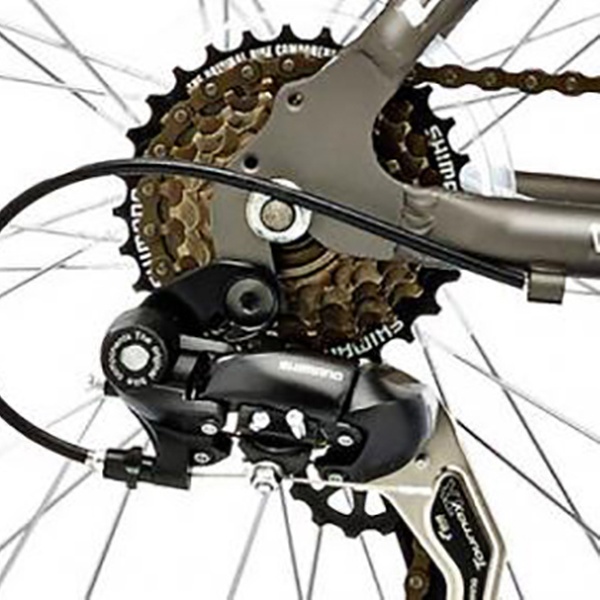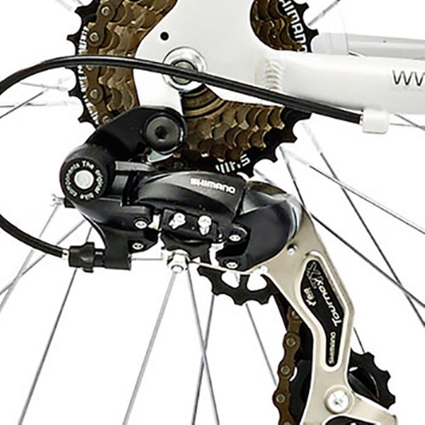 - Gears: 18-speed with Shimano Revoshift shifters, Shimano rear derailleur, and Shimano 14-28 tooth freewheel