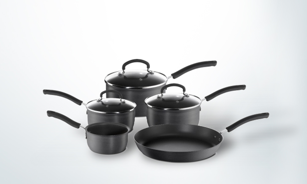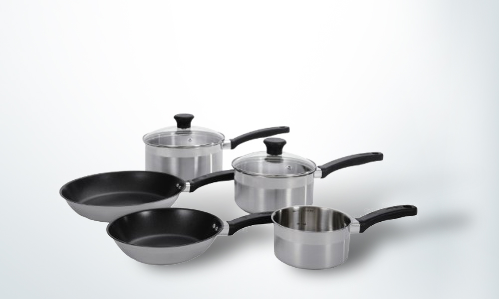 - Sets include a milk pan, two saucepans and two frying pans