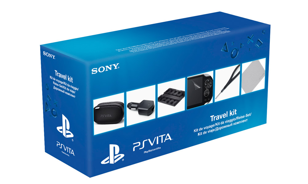 - Sony PS VITA Travel Kit, which includes travel pouch, car adaptor, PlayStation Vita card case, protective film, wrist strap and cleaning cloth