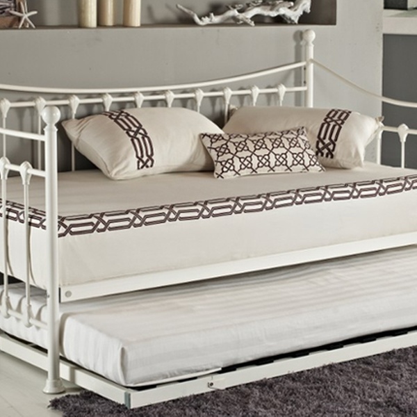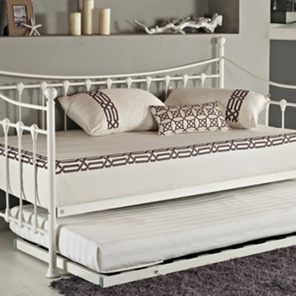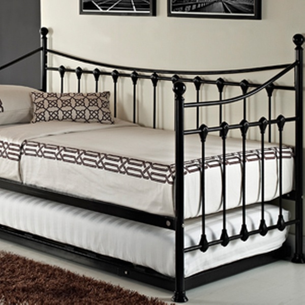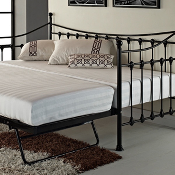 This day bed displays a three-railed metal frame echoing a vintage French style and is available in black or white metal. The single day bed offers a sleeping and seating solution to maximise a bedroom’s space and can include an optional trundle which fits beneath the day bed and may be pulled out as easily as it slides in.