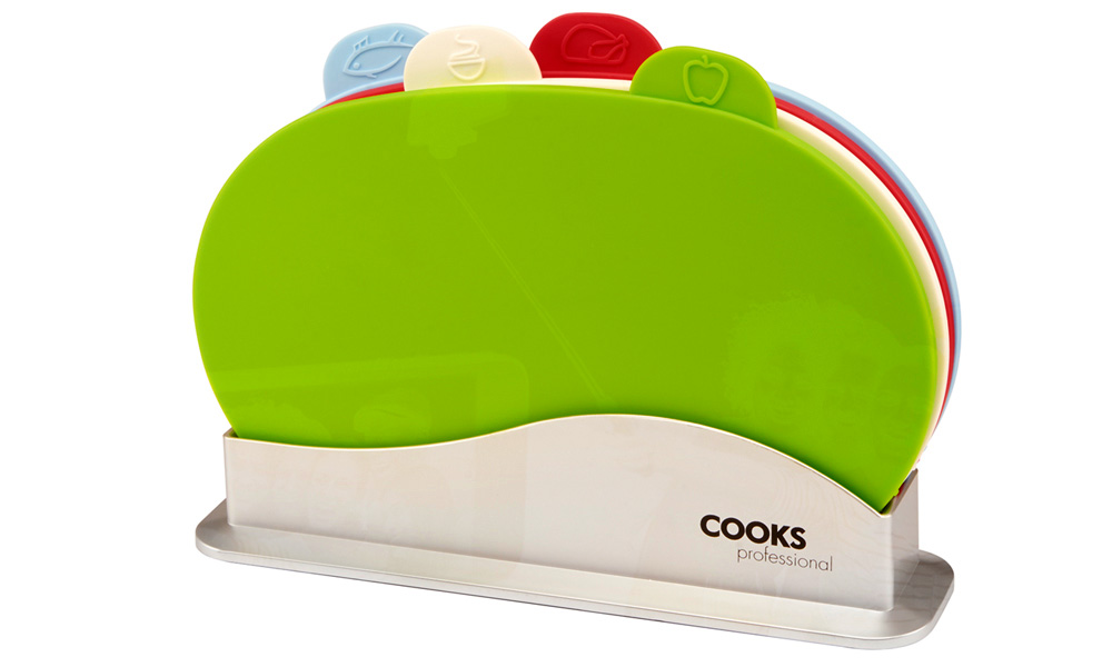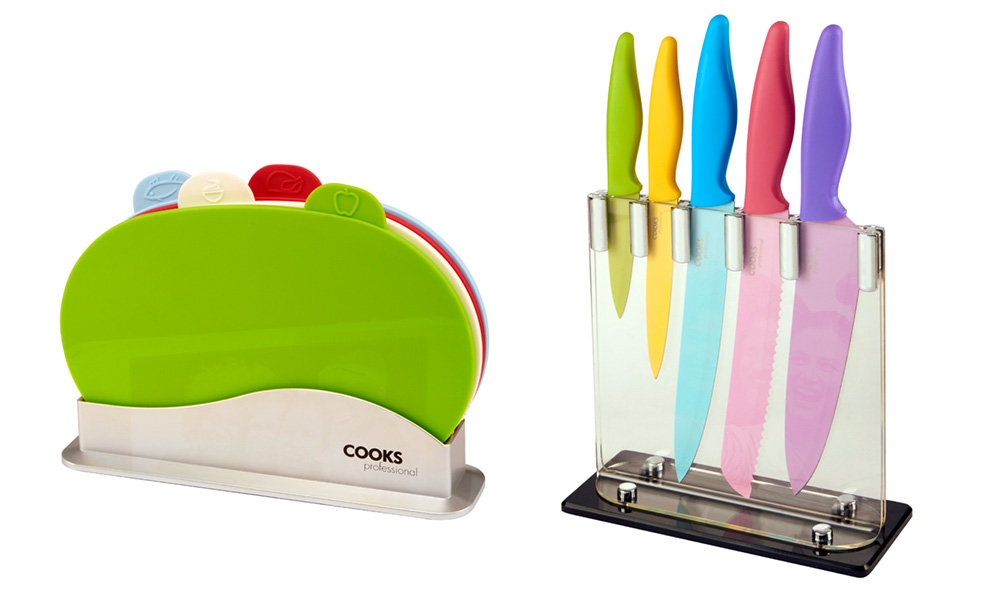 Colour-coded to avoid cross contamination of food, these Cooks Professional sets come in the form of a five-piece knife set. The five knives all feature sharp, non-stick blades with ergonomic handles, and are dishwasher safe for convenience. A four-piece chopping board set can be added alongisde. They are presented in a non-slip rack, and in an index style complete with illustrated tabs.