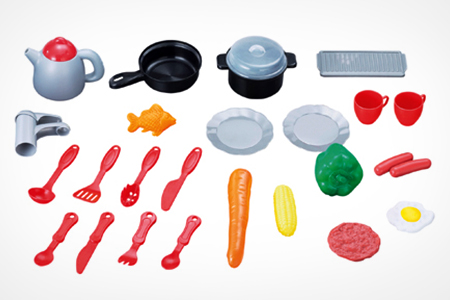 - 26-piece accessory set including pots, pans, cutlery and play food